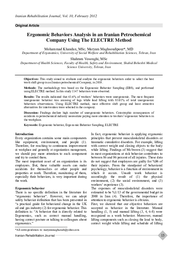 Pdf Ergonomic Behaviors Analysis In An Iranian Petrochemical Company Using The Electre Method Shahram Vosoughi Academia Edu