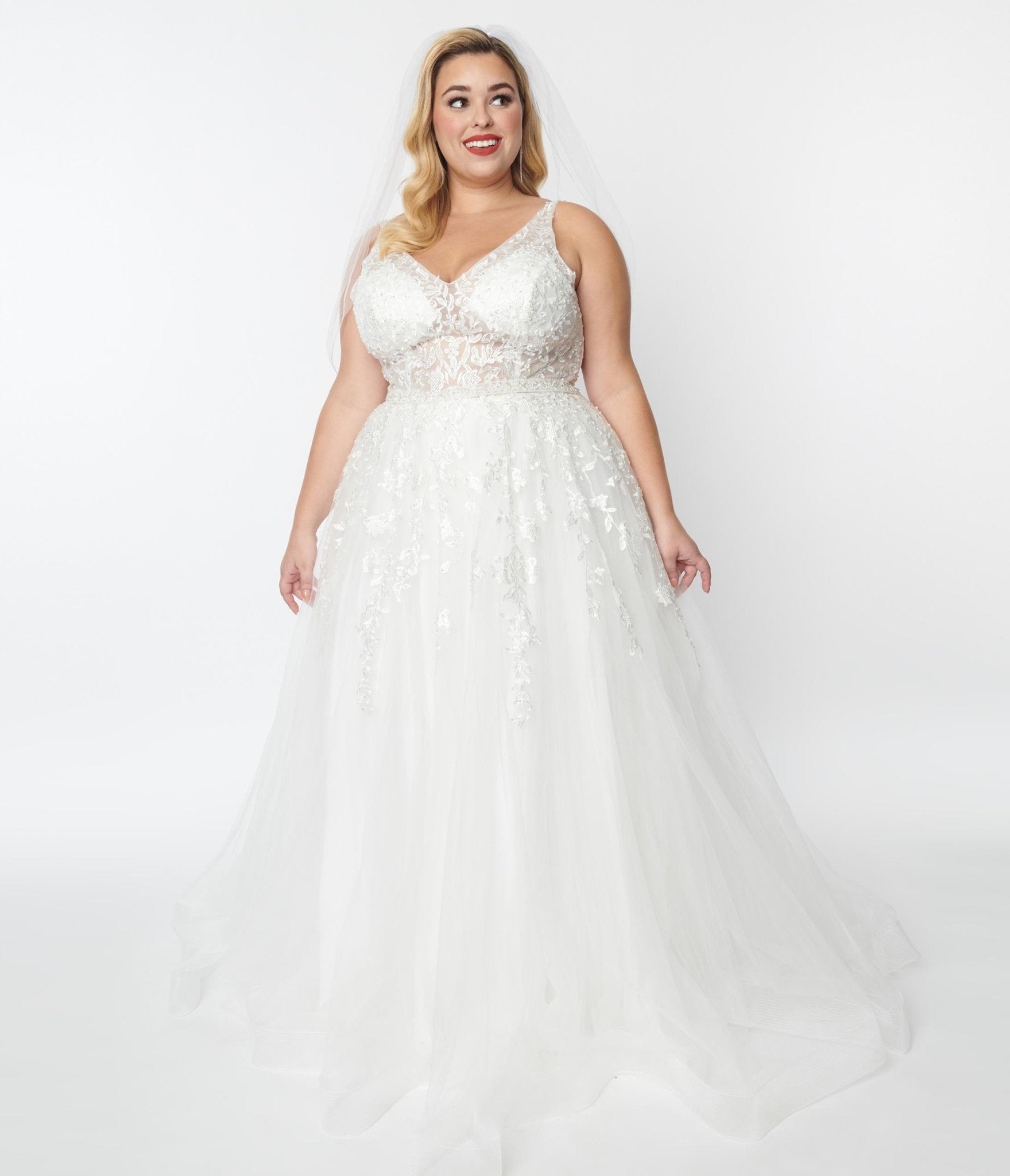 Plus Size Ivory Floral Lace Tulle Wedding Ball Gown Unique Vintage
